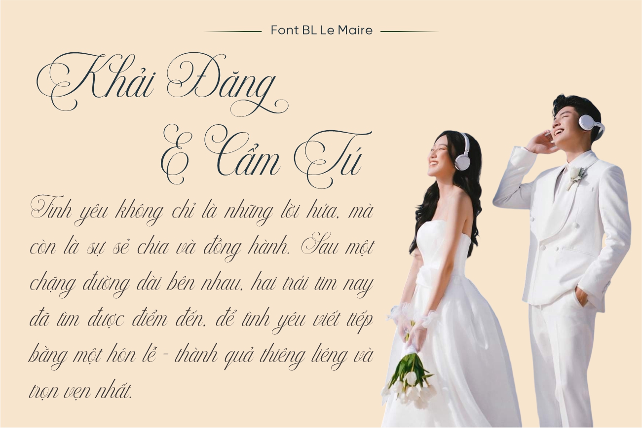 Trong thiết kế thiệp cưới, phông chữ đóng vai trò cực kỳ quan trọng để truyền tải thông điệp yêu thương và tạo nên dấu ấn riêng cho từng cặp đôi. Một font chữ đám cưới đẹp không chỉ mang lại sự tinh tế mà còn góp phần làm nổi bật phong cách của buổi lễ. Trong số đó, BL Le Maire Việt hóa là lựa chọn lý tưởng, mang đến cảm giác sang trọng, bay bổng và đầy lãng mạn.