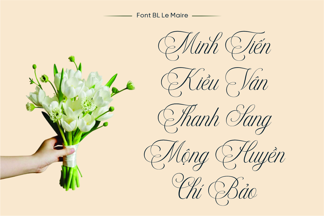 BL Le Maire vốn là một thiết kế của Pixesia Studio, thuộc thể loại script calligraphy hiện đại. Với những nét chữ uốn lượn mềm mại, đường cong thanh mảnh cùng các flourish tinh tế, font mang đến vẻ đẹp quý phái, rất phù hợp để sử dụng trong thiệp mời cưới, menu tiệc, backdrop sân khấu hay bảng tên cô dâu chú rể. Sau khi được Team BL Việt hóa đầy đủ dấu tiếng Việt, font càng trở nên dễ sử dụng cho các nhà thiết kế trong nước, đảm bảo tính thẩm mỹ và chuẩn xác trong mọi nội dung.