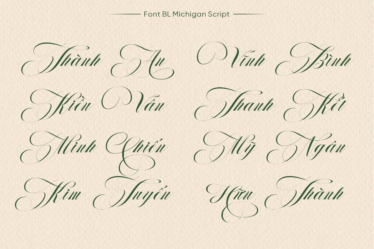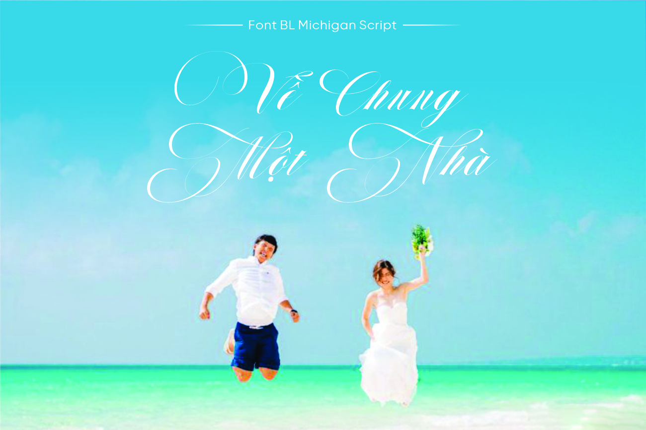Khác biệt lớn của BL Michigan Script so với bản gốc nằm ở bộ ký tự tiếng Việt đầy đủ, được Việt hóa cẩn thận để không bị lỗi dấu. Nhờ vậy, font dễ dàng ứng dụng trong môi trường thiết kế trong nước mà vẫn đảm bảo tính thẩm mỹ. Từ các cụm chữ như “Về chung một nhà” cho đến tên cô dâu chú rể, BL Michigan Script luôn thể hiện được vẻ đẹp lãng mạn và tinh tế.